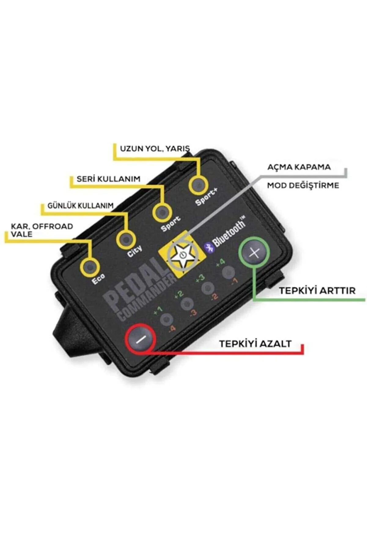 Pedal Commander, kendi içerisinde bulunan modları ile sürüş keyfinizi ikiye katlayacaktır. Yazılım olmadığı için aracın beynine zarar vermez, muayenede engel değildir.